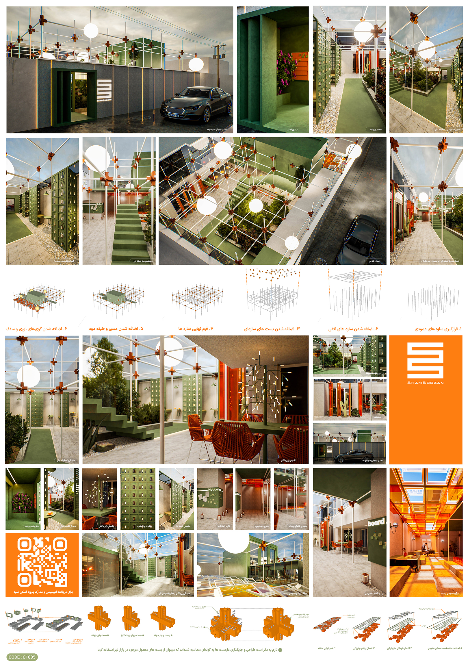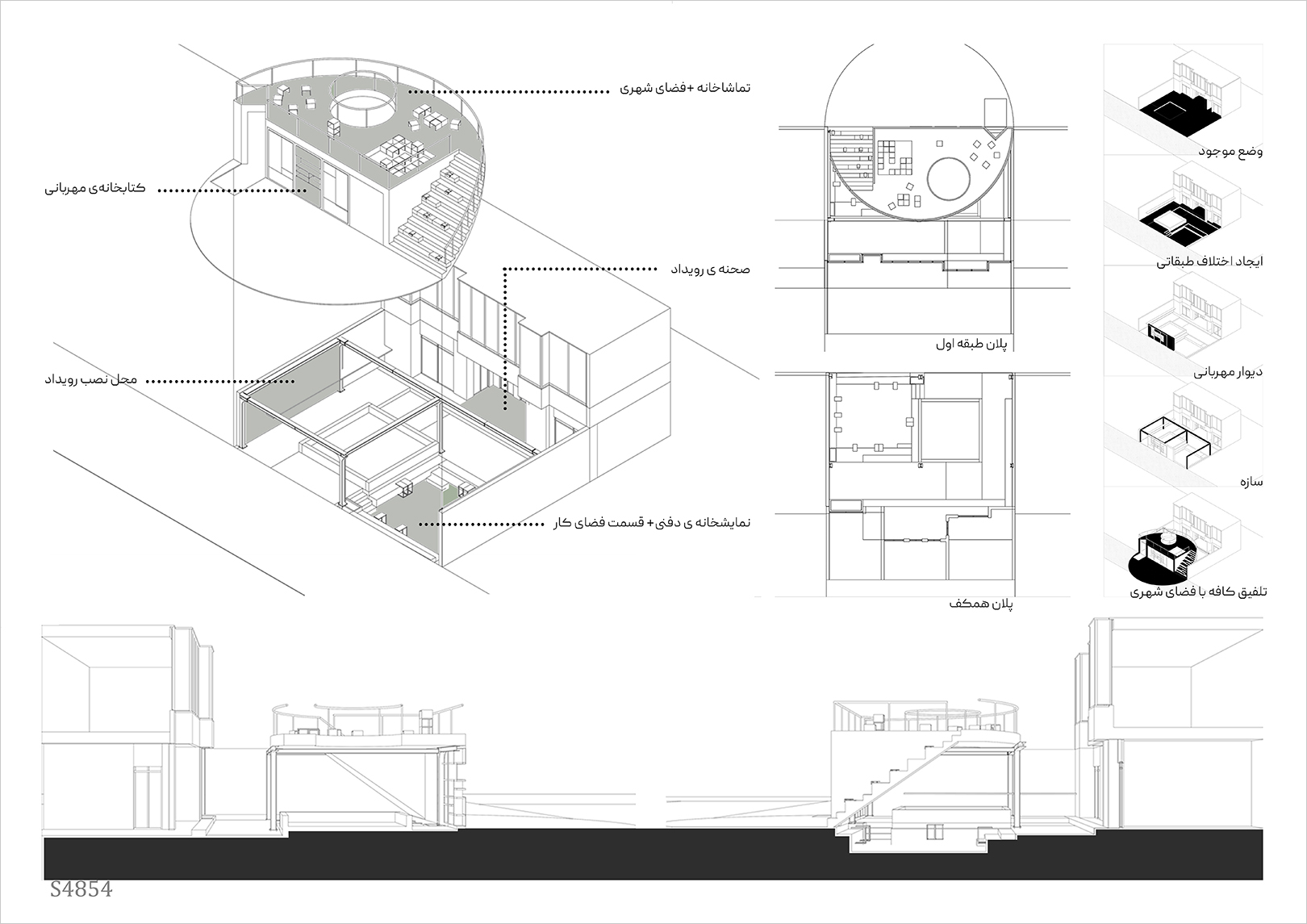 پروژه برنده رتبه اول با ایدهای شجاعانه و جسورانه، فراتر از مرزهای معمول حرکت کرده و پرسشی تازه درباره رابطه معماری و شهر مطرح ساخته است. در شرایط امروز که مردم بیش از پیش به زندگی شهری و بازپسگیری فضاهای عمومی گرایش دارند، این اثر پیامی ارزشمند درباره شهر و نقش معماری در آن ارائه میدهد. این پروژه با نگاهی معاصر به معماری و فضای عمومی، طرح را در اتصال با شهر و به مثابه فضایی دعوتکننده و اجتماعی دیده که میتواند همچون یک نشانه یا نقطهای کانونی در محله عمل کند و تاثیر عمیقی بر بافت شهری بگذارد. در همین راستا، افزودن یک سطح تازه به پروژه و پلههای دسترسی به آن که کوچه را به صحنه نمایش بدل میسازند، این امکان را فراهم کرده است که فضای جلوی کافه به پاتوقی شهری و پویا تبدیل شود.